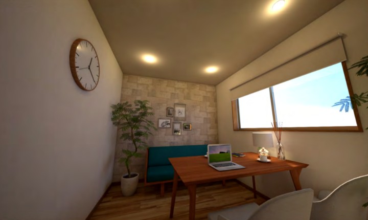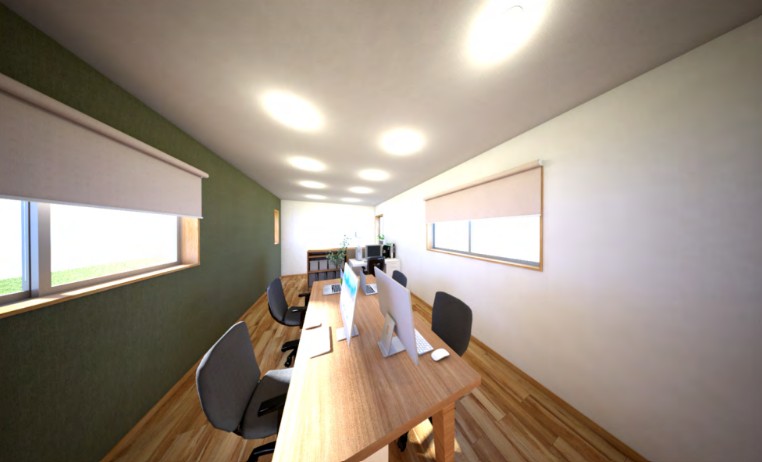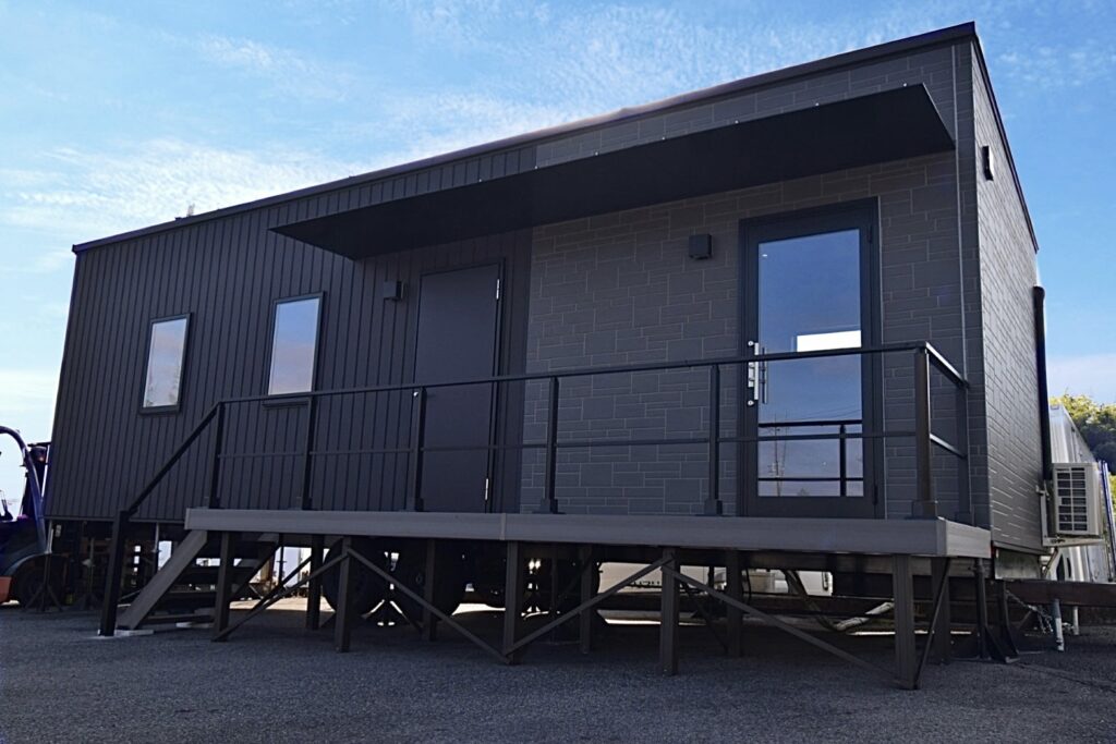 今回は8Mのトレーラーハウスを2台使用し、オフィススペース・応接室・休憩室の3部屋を設けました。オフィス・休憩室はすっきりとしたナチュラルな雰囲気、応接室兼社長室はラグジュアリーで重厚感のある仕上がりとなりました。