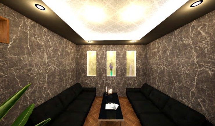 空間を広く演出する折り上げ天井、煌びやかなクロス、照明を仕込んだニッチなど