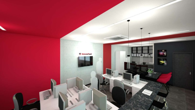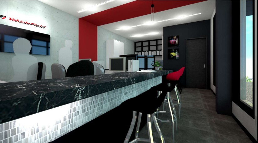 内装にはインパクトのあるクロスを使用し、従来の自動車整備会社のイメージを覆す様な遊び心を詰め込んだ待合室・事務所となりました。