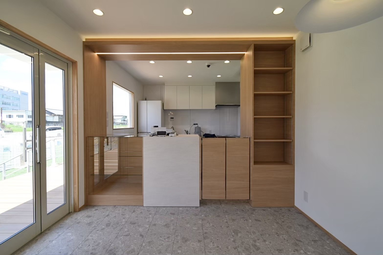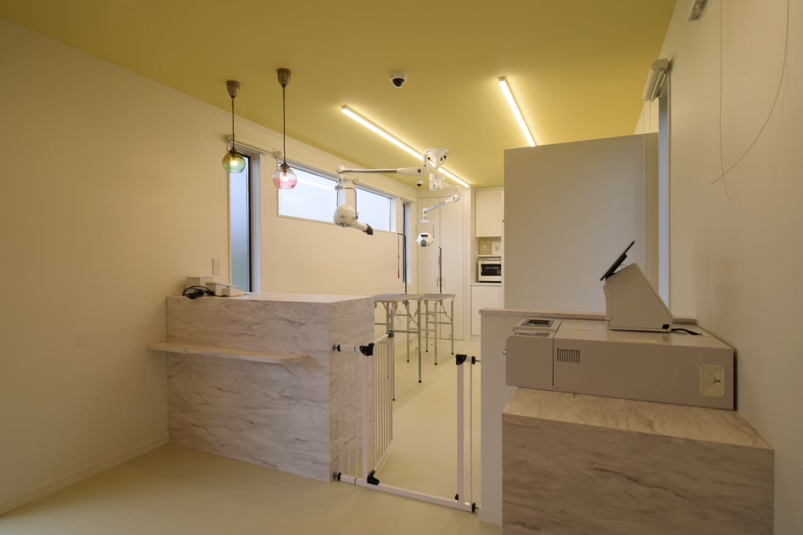 癒しの場となるよう、ナチュラルな木目、ホワイト、パステルカラーを使用し柔らかい印象に仕上げました。また、ドッグランで遊ぶワンちゃんを眺められるようカウンターへ開放的なFIX窓を取り付けました。